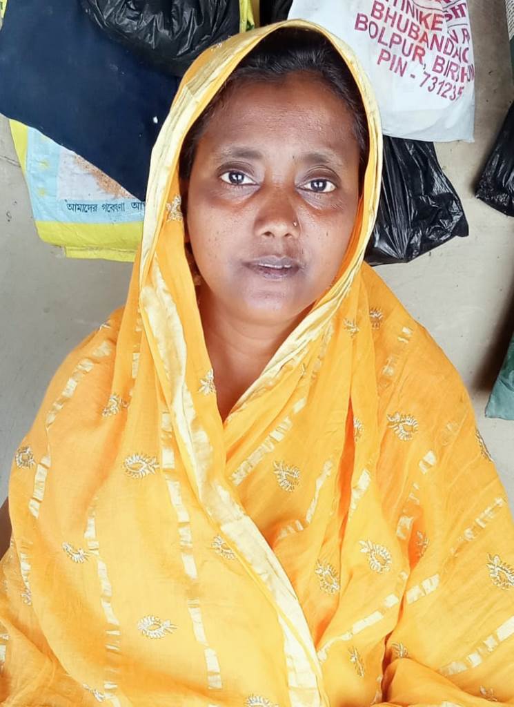 Nurjahan Khatun is a resident of Agortore village of Nanoor block; Birbhum. She is weaving Kantha for over 16 years. She is skilled in making intricate designs over various items such as – stole, dupatta, saree, cushion covers, bed covers and other utility products. Nurjahan has participated in fairs around Shantiniketan and other areas. Along with her own works and participating in fairs, Nurjahan has been a trainer for many basic training workshops.