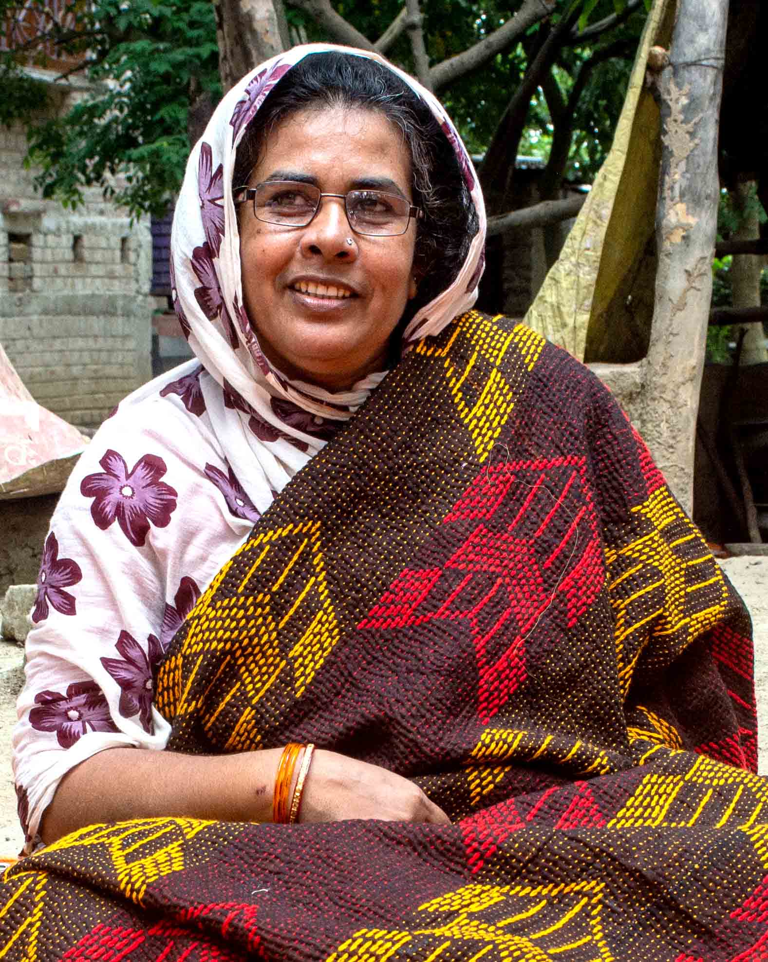 Najma Sultana joined hands with her mother and maternal aunt, and started learning the kantha stitch when she was 10. She almost visited all the states of India and took part in different exhibitions. She makes beautiful scarves and stoles