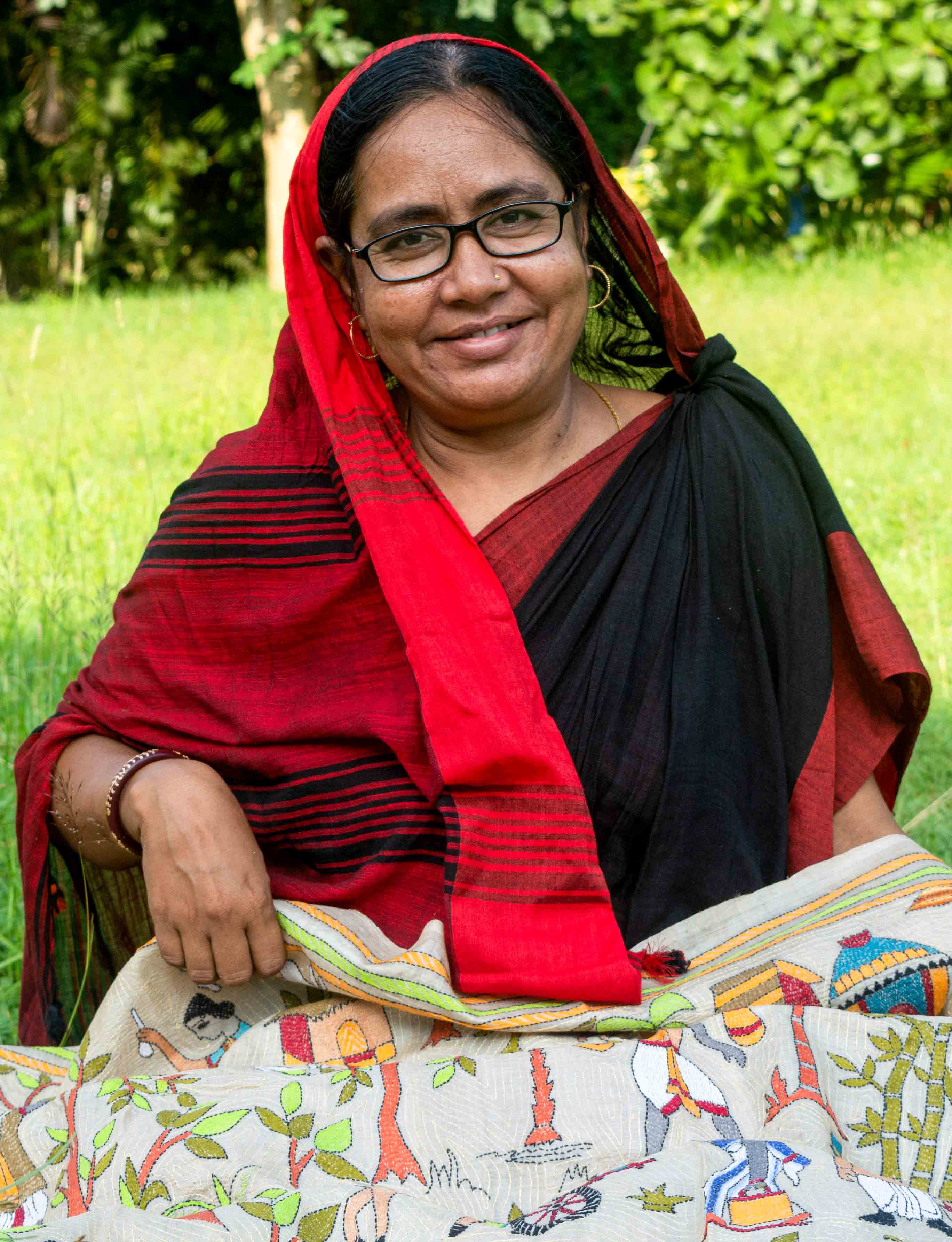 Mili Bibi is a resident of Natunpara village of Nanoor block; Birbhum weaving Kantha for 16 years. She is skilled in making intricate designs over various items. She has participated in Kolkata, Delhi, Bhubaneshwar, Chandigarh, Berhampore and Goa.